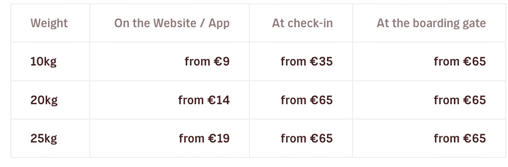 • Carry-on Suitcase Fee: With a priority boarding ticket, a carry-on suite case (10kg) is included, which is about 20 euros per flight (40 euros round trip)